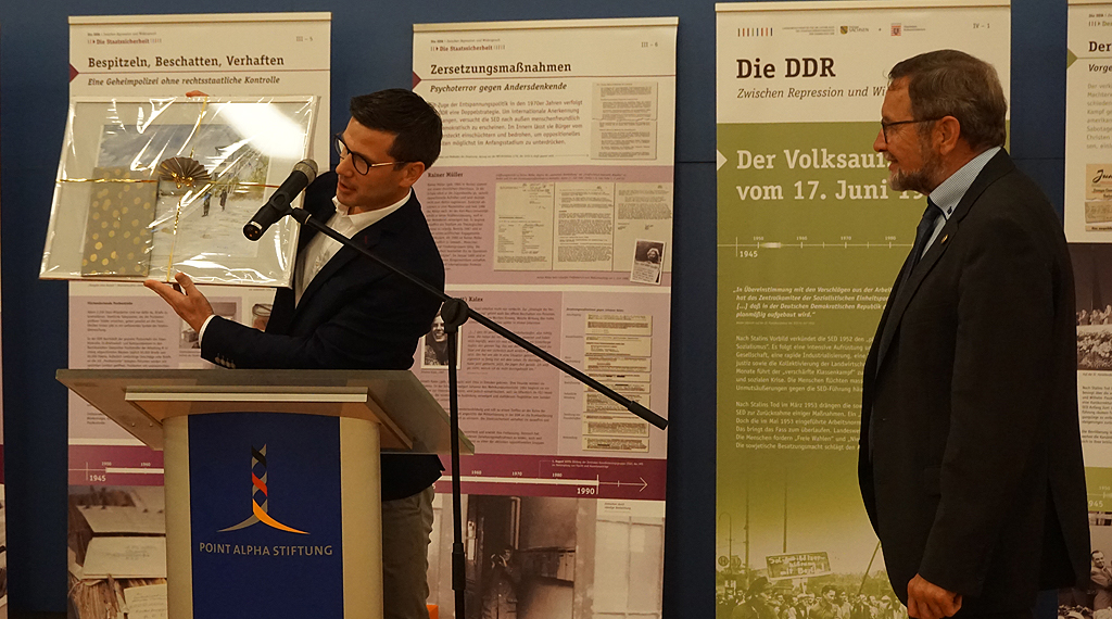 „Dort wo ein Ende ist, ist auch ein Anfang“, leitete Heck zur Ernennung der neuen Geschäftsleitung über. Der neue Geschäftsführer Sebastian Leitsch aus Petersberg steht für Kontinuität, möchte aber auch eigene Akzente setzen: „Ich möchte zusammen mit den engagierten Kolleginnen und Kollegen den eingeschlagenen Zukunftsweg weitergehen und so dazu beitragen, dass die Gedenkstätte Point Alpha weiterhin Vergangenheit, Gegenwart und Zukunft miteinander verbindet.“ Der 35-Jährige bedankte sich bei seinen Vorgängern und überreichte im Namen der Stiftung Fennel zum Abschied ein Bild mit einem Motiv von Point Alpha. Vor allem Qualität steht in der Gedenkstätte Point Alpha im Fokus. Seinen Teil dazu beitragen möchte Dr. Roman Smolorz, seit dem Frühjahr der Wissenschaftliche Leiter der Stiftung. Der 52-Jährige, der zuvor wissenschaftlicher Mitarbeiter an der Universität zu Köln und in verschiedenen Funktionen am Standort Regensburg tätig war, verfügt über die Kompetenz im Schnittbereich Erinnerungspolitik, Wissenschaft und Dokumentation. +++ pm