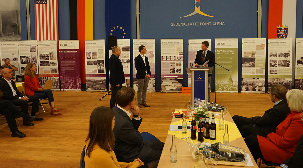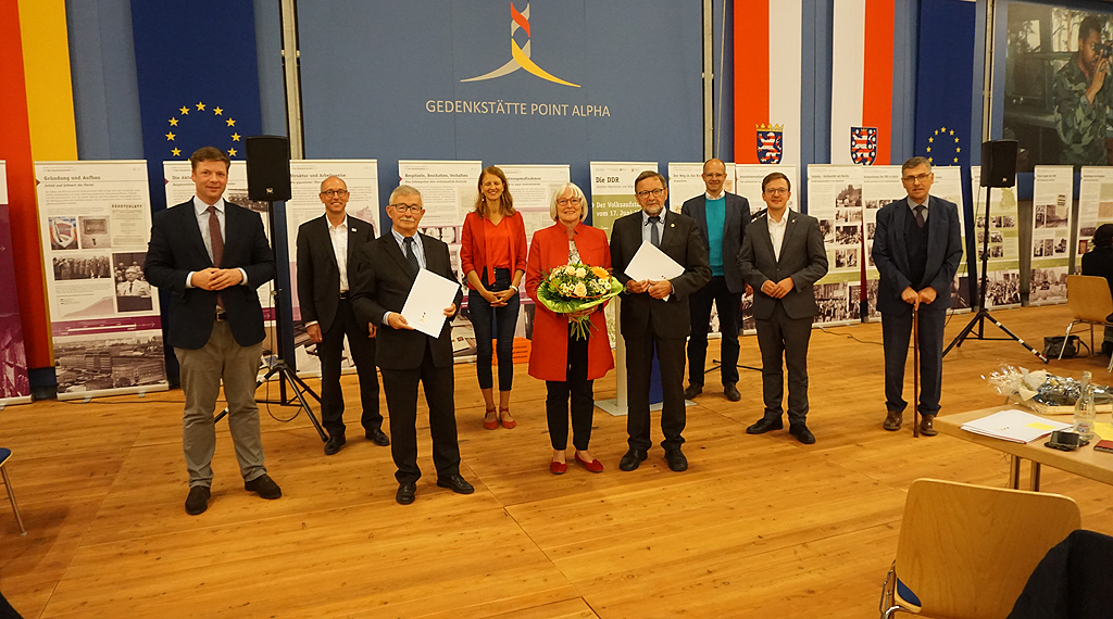 Dr. Heck und Herr Schmitt überreichten dem ehrenamtlichen Vorstand schließlich für den vorbildlichen Einsatz eine Urkunde und ein Weinpräsent. Auch die vielen Ehrengäste bedankten sich persönlich bei Fennel und Jost. Dazu zählten unter anderem der hiesige CDU-Bundestagsabgeordnete Michael Brand, der Leiter der Hessischen Landeszentrale für politische Bildung Dr. Alexander Jehn, der Landrat des Wartburgkreises Reinhard Krebs, der hessische Staatssekretär a.D. Dr. Walter Arnold, Geisas Bürgermeisterin Manuela Henkel, Rasdorfs Bürgermeister Jürgen Hahn, Prof. Dr. Karl Schmitt vom wissenschaftlichen Beirat, Stefan Sachs für den Förderverein Point Alpha, der ehemalige Thüringer Landtagsabgeordnete Dr. Hans-Peter Häfner, sowie der US-Verbindungsoffizier Major Eric Kirsch, Renate Stieber von der German-American Cultural Association und Craig Bichard von der Blackhorse Association.