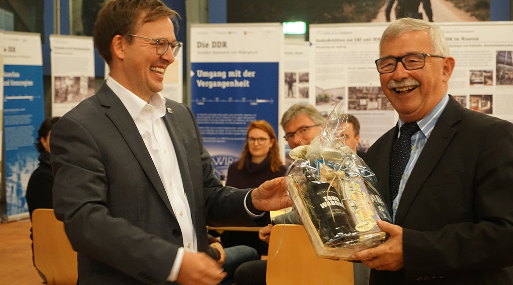 Für Fennel ist die Zwischenetappe Point Alpha nun beendet. In seiner Rede ließ Fennel seine Verbundenheit mit der Point Alpha Stiftung Revue passieren. Unser Ziel war es, die Gedenkstätte zukunftsfähig zu machen. Und dabei hätten sich Jost und er nie abstimmen müssen: „Jeder wusste, was er an welcher Stelle zu machen hatte“. Dr. Fennel schilderte einige Stationen der Modernisierung und der Veränderungen und ging auf die wichtigen Aufgaben, Ziele und die Bedeutung der Gedenkstätte ein. Ein Dank ging an alle Ratgeber, Unterstützer, Institutionen, Geldgeber und den Mitarbeitern, die geholfen hätten, die Baustellen abzuarbeiten. Berthold Jost bleibt der Point Alpha Stiftung weiterhin als ehrenamtliches Vorstandsmitglied erhalten. Allerdings nicht mehr an vorderster Front, sondern mit einer beratenden Funktion für die beiden neuen Geschäftsführer. Jost erzählte im Zeitraffer von Anfängen des Areals als US-Beobachtungspunkt, zu Beginn noch ein Zeltlager ohne Wasserleitung, sowie dessen weitere Entwicklung, vom Abschied der US-Armee, vom Asylbewerberheim bis zum Ausbau der Anlagen zum Museum Erlebnisse und Veränderungen, die er als damaliger Bürgermeister von Rasdorf zum Großteil hautnah miterlebt hatte. Seinen Nachfolgern wünschte er eine glückliche Hand.