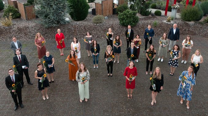 Gloria Döppner und Sascha Rühl gaben seitens der Ausbildungsleitung noch einmal einen Rückblick auf die unterschiedlichen Formen der Aus- und Weiterbildung und blickten auf die gemeinsame Zeit zurück: „Ihr habt sehr viel geleistet und engagiert die verschiedensten Herausforderungen angenommen, die durch die Pandemie zusätzlich erschwert wurden. Wir sind sehr stolz auf euch und freuen uns sehr, dass ihr uns als neue Kolleginnen und Kollegen erhalten bleibt. Ihr schlagt nun ein neues berufliches Kapitel auf.“ Die Ehrungen nahm Vize-Landrat Frederik Schmitt vor. Als kleine Anerkennung erhielten die Absolventinnen und Absolventen Blumen und Geschenke. Besonders beglückwünscht wurden Annika Nüchter und Sophia Weber. Sie sind in ihren Berufsbildern jeweils Lehrgangsbeste.