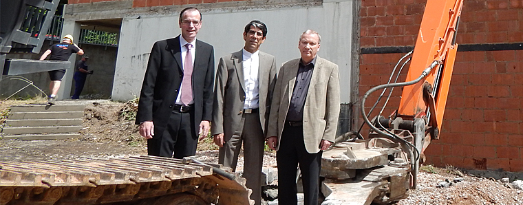 Verwaltungsdirektor Dr. Christof Erdmann, PHV-Architekt Hamid-R. Nafisi und der Technische Leiter am Eichhof, Jürgen Wendler, am zukünftigen Standort des neuen Dialysezentrums, auf dem derzeit noch die Abrissarbeiten des ehemaligen Schwesternwohnheims durchgeführt werden.