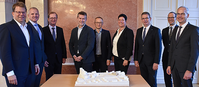 Das Wohnbauprojekt an der Pacelliallee/Dr.-Dietz-Straße, welches in der direkten Nachbarschaft zum Klinikum Fulda liegt, geht in die Umsetzungsphase: Ende 2024 soll das Bauvorhaben fertiggestellt sein. Nun gab es den symbolischen Startschuss mit allen Beteiligten im Marmorsaal des Fuldaer Stadtschlosses. „Das Wohnbauprojekt ist ein echtes Gemeinschaftswerk“, so Oberbürgermeister Dr. Heiko Wingenfeld über die Beteiligung der GWH Bauprojekte GmbH, der Sparkasse Fulda, des Klinikums Fulda und der Stadt Fulda für die Bebauung des Eckgrundstücks in unmittelbarer Nähe zum Klinikum. „Es ist schön, dass wir heute ein klares Zeichen setzen können, dass das Projekt Pacelliallee voran geht und realisiert wird“, bekräftigen OB Wingenfeld und Stadtbaurat Daniel Schreiner.
