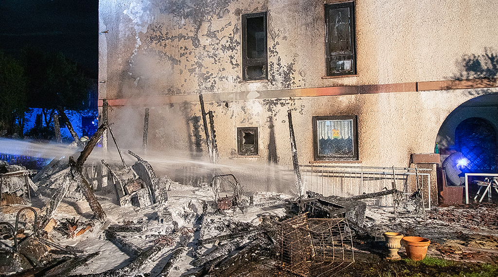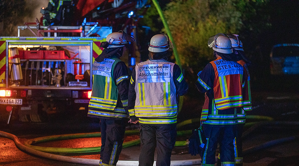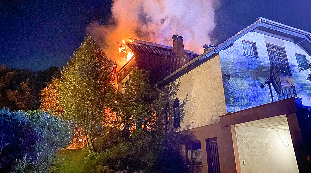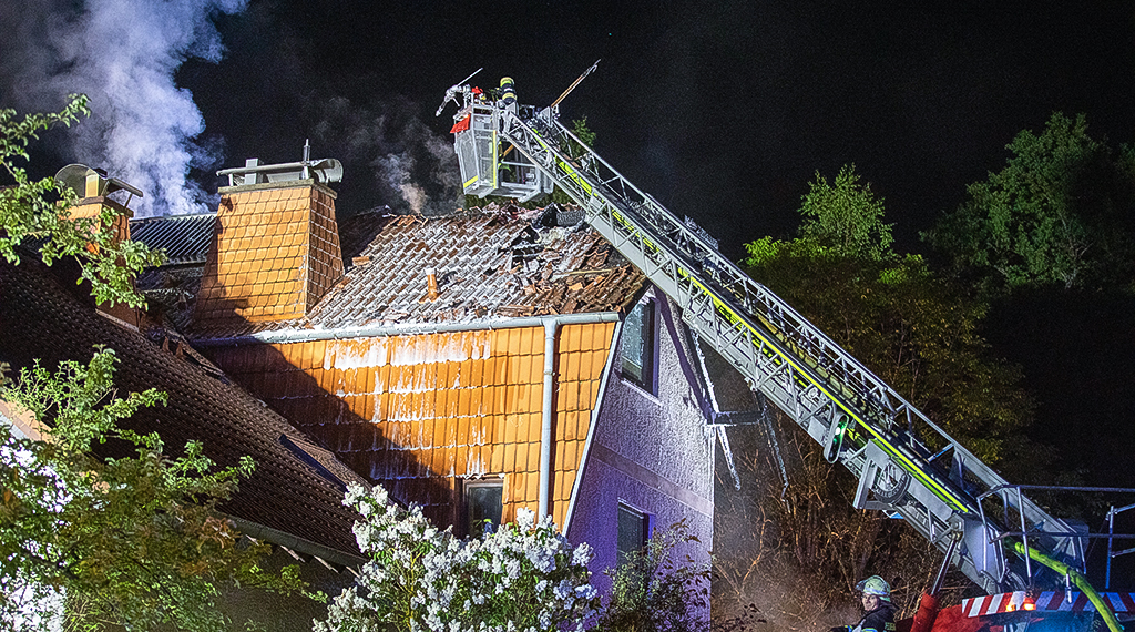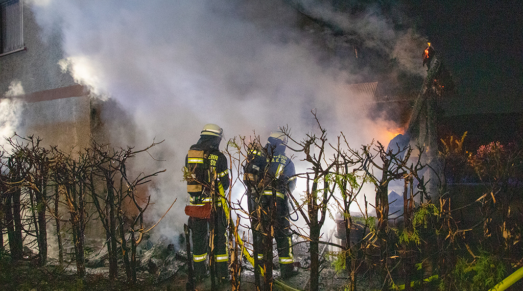 Großer Schreck für die Bewohner eines Wohnhauses in Steinau an der Straße am späten Sonntag Abend! - Plötzlich platzen Fensterscheiben, erst jetzt bemerken die Bewohner, dass die Gartenhütte neben dem Haus in Vollbrand steht. Das Feuer breitet sich bereits aus und droht auf das Wohngebäude überzugreifen. Nachbarn, die unter anderem selbst bei der Feuerwehr sind, werden ebenfalls durch das enorme Feuer geweckt und holen die Bewohner aus dem Brandhaus. "Ich habe gedacht es wäre schon Morgens weil alles so hell erleuchtet war als der Melder ging, dabei stand die Fassade nur in Flammen" - so Sven Schlegel, der Kommandant der freiwilligen Feuerwehr und ein Nachbar. Schlegel fordert zudem auch weitere Kräfte an. Obwohl die Einsatzkräfte schnell vor Ort sind und einen massiven Löschangriff starten breiten sich die Flammen zunächst auf das Obergeschoss und den Dachstuhl aus. Um das Feuer besser bekämpfen zu können fordert die Feuerwehr eine zweite Drehleiter aus einem Nachbarort an. Über diese wird im Anschluss auch die Suche nach Glutnestern im Dachbereich gestartet, wofür nämlich auch größere Teile des Dachs abgedeckt werden müssen. Zwar kann die Feuerwehr einen Vollbrand des Dachstuhls und des Obergeschosses verhindern, doch ist das Haus aufgrund des Feuers und des Löschwassers zunächst unbewohnbar. Glücklicherweise wird bei diesem Brand niemand verletzt, die Bewohner kommen zunächst bei Nachbarn unter. Der Sachschaden wird sich, ersten Schätzungen zu folge, auf rund 400.000 Euro belaufen. Neben der Gartenhütte und dem Dachstuhl wurde auch die Solaranlage des Hauses zerstört. Die Polizei hat die Ermittlungen zur Brandursache aufgenommen. +++ Mehr Blaulichtberichte auf unserer Blaulichtseite - osthessen112.