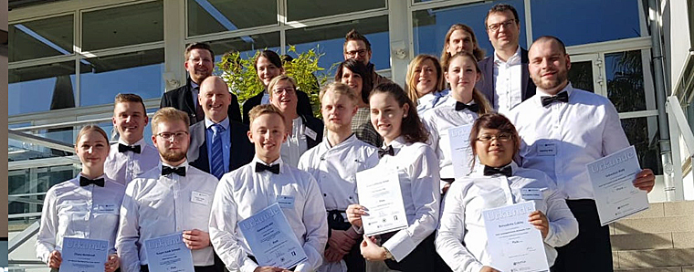 Am 18./19.03.2019 fanden im Gesellschaftshaus Palmengarten die 38. Hessischen Jugendmeisterschaften und der 14. Azubi Award Systemgastronomie statt. Diese Wettbewerbe werden vom Hotel- und Gastronomieverband DEHOGA Hessen gemeinsam mit dem Verband der Köche und dem Verband der Serviermeister, Restaurant- und Hotelfachkräfte durchgeführt. Insgesamt stellten sich 42 Teilnehmerinnen und Teilnehmer aus ganz Hessen den Herausforderungen der Wettbewerbe. Die Tischdekoration des festlichen Prüfungsessens stand dieses Jahr unter dem Motto „Eine Zeitreise durch die Musikgeschichte“ und so konnten die jungen Azubis die fast 200 Ehrengäste mit kreativen Ideen überraschen. Die Siegerinnen und Sieger erhielten Sachpreise in Form von digitaler Elektronik. Bei den Hessischen Jugendmeisterschaften konnte Konstantin Will vom Hotel Lenz in Fulda mit einem 2. Platz im Hotelfach überzeugen, aber auch Saskia Kuhn vom Burger King Kirchheim erreichte einen dritten Platz im Azubi Award Systemgastronomie. Begleitet wurden die jungen Leute von Schulleiter Jörg Demuth, dem stellvertretenden Schulleiter Boris Krieg, Abteilungsleiterin Margit Goldstein, Studienrätin Sandra Leister sowie Fachlehrerin Sabine Heil, die die jungen Leute im Unterricht betreut hatten und nun auch zu den ersten Gratulanten gehörten. +++