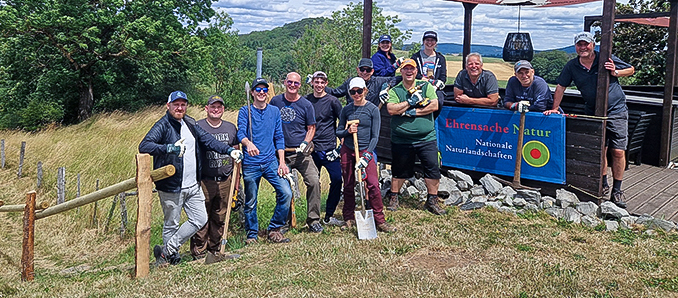 Vom Arbeitsplatz in München, Hamburg, Erfurt und Frankfurt in die Rhöner Natur: Zwei Tage lang haben Mitarbeiterinnen und Mitarbeiter des Software-Unternehmens Salesforce bei Arbeiten am Premium-Wanderweg „Der Hochrhöner“ mit angepackt. Sie sind Teilnehmende des Programms „Ehrensache Natur“ von Nationale Naturlandschaften e. V., das es Unternehmen ermöglicht, sich praktisch für den Naturschutz zu engagieren. Betreut wurden die Freiwilligen von Arnold Will, Ranger bei der Hessischen Verwaltung des UNESCO-Biosphärenreservat Rhön, und seinem Naturpark-Kollegen Julian Fink.