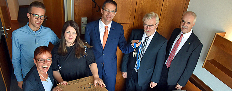 Visite und Schlüsselübergabe im HKZ: Landrat Dr. Michael Koch und Klinikchef Martin Ködding übergeben symbolisch die Zimmerschlüssel an Prof. Seitz. Nico Blaurock und Johanna Freund (Anwärter für den gehobenen Dienst) haben schon einmal die Kartons gepackt.