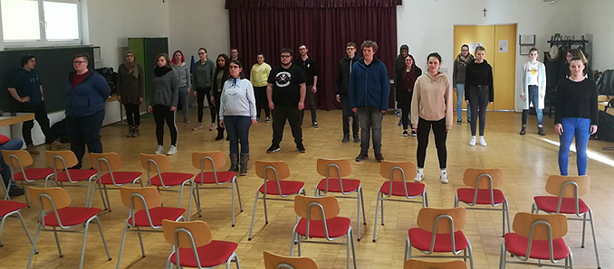 Am Ende ist das Stück „DaSeinsSchatten“ entstanden. In einer skurrilen TV-Show werden mit „humorvollem Ernst“ Situationen gespielt, in denen die Verführung im Alltag lauert und sich lustig über uns macht, wenn wir ihr nachgeben. Wir alle kennen solche Situationen. Die Frage ist nur, mit welcher Haltung und mit welcher Widerstandskraft wir diesen begegnen. Bevor es zu der Präsentation am 2. April dieses Jahres im Lokschuppen in Hünfeld kommen konnte, wurden die Akteure von der Corona-Pandemie ausgebremst. Die Aufführung des Stücks sollte als Höhepunkt einer intensiven Auseinandersetzungs- und Probephase fungieren. Doch dann wurde alles öffentliche Leben heruntergefahren. Doch die Klasse konnte sich neu motivieren, einzelne Szenen im Solo zu spielen und zu filmen. Der Zusammenschnitt ist eine gelungene Darstellungsform, die Botschaft des Stückes als Film zu veröffentlichen und als Impuls für andere zur Verfügung zu stellen.