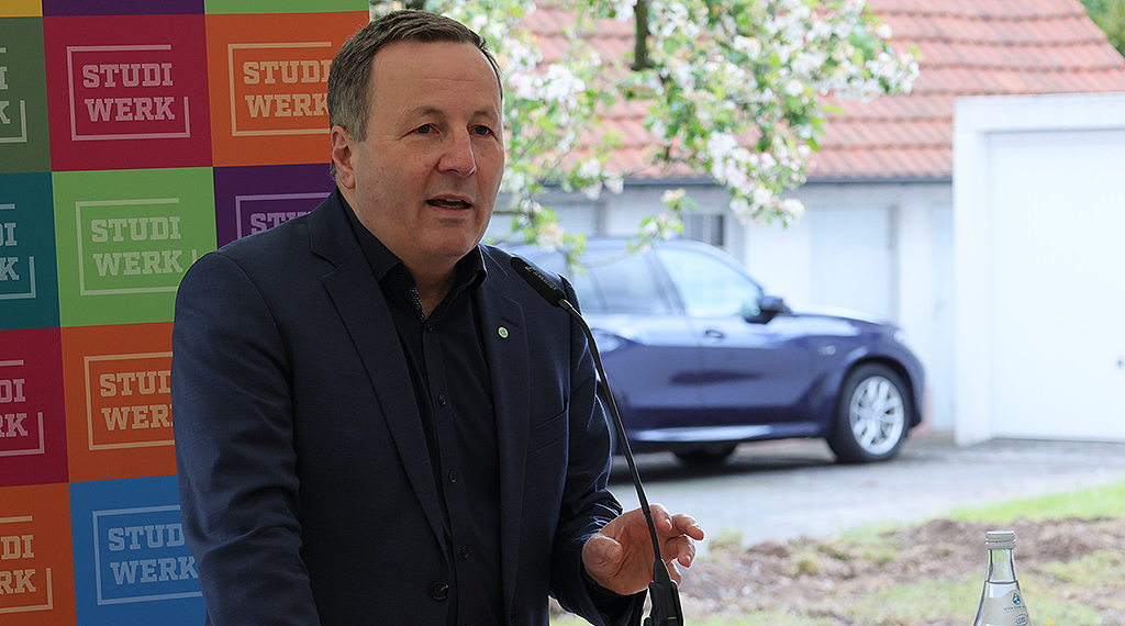 „Angefangen haben wir in Fulda mit 124 Wohnheimplätzen in der Wiesenmühlenstraße, die nun mit der Vermietung der Trimburgstraße auf 509 Plätze insgesamt angewachsen sind“, hob Tilman Dabelow, kommissarischer Geschäftsführer des Studierendenwerks Gießen, die positive Entwicklung am Standort Fulda hervor. „Das ist vor dem Hintergrund der in den letzten Jahren gestiegenen Studierendenzahlen noch nicht genug, aber auch kleine Schritte bringen uns ja alle ein Stück voran“, so Dabelow weiter. Besonders freute er sich über die konstruktive Zusammenarbeit mit der AR-Immo GmbH, dank der es möglich war, das Wohnheim in wenigen Monaten zu realisieren. Über die Kaufsumme wurde Stillschweigen vereinbart. Der Präsident der Hochschule Fulda, Professor Dr. Karim Khakzar, betonte in seinem Grußwort ebenfalls den nach wie vor hohen Bedarf an bezahlbarem studentischem Wohnraum in Fulda und Umgebung: „Dies gilt ganz besonders für die wachsende Zahl internationaler Studierender. Insofern bin ich sehr froh, dass es dem Studierendenwerk Gießen gelungen ist, in unmittelbarer Nähe zur Hochschule weitere 43 Wohnheimplätze zu schaffen.“