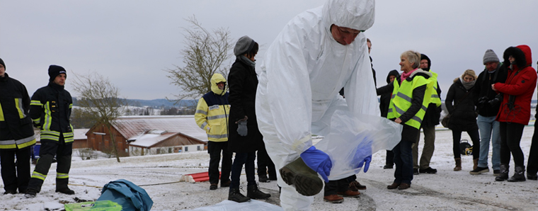 Für genau diesen Fall trainierte man nun in Heblos. Das Dorfgemeinschaftshaus wurde zur Einsatzzentrale umfunktioniert, die voll gesperrte Kreisstraße zur Reinigungsstelle umgebaut und ein Viehbetrieb zum fiktiven Ort des Seuchenausbruchs erklärt. Rund 100 Einsatzkräfte von Behörden, DRK, Feuerwehr und THW rückten zu der Übung an, um wie in Ernstfall binnen 24 Stunden die nötige Logistik zu stellen. Im Gemeinschaftshaus wurde dazu ein sogenannter Schwarz-Weiß-Bereich eingerichtet, diese organisatorische Maßnahme soll im Seuchenfall eine Verschleppung des Viruses im Gebäude verhindern. So wurden Umkleiden definiert, Kleiderausgaben eingerichtet und sogar eine mobile Sanitäreinrichtung organisiert. Auf der Kreisstraße bauten Einheiten des THWs aus Alsfeld, Lauterbach und Schwalmstadt eine Fahrzeugschleuse auf, der Gefahrstoffzug des Landkreises mit Feuerwehrleuten aus Alsfeld eine Personenschleuse. An diesen Schleusen trainierten die Veterinäre die Dekontamination, also die Maßnahmen zur Verhinderung der Verschleppung des Viruses. Dazu zählte auch das richtige Anlegen und Ablegen der Schutzkleidung.