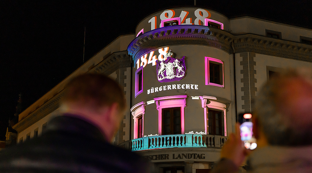 Im Jahr 2026 wird der Landtag mit zahlreichen Veranstaltungen die Geschichte des Landes Hessen feiern. Die Lichtshow auf dem Hessischen Landtag bildet im Rahmen des runden Jahrestages der Proklamation Hessens den Auftakt zum Jubiläumsjahr und schenkt Wiesbaden – das auf den Tag genau vor 80 Jahren am 2. Oktober 1945 zur Landeshauptstadt ausgerufen wurde – damit dauerhaft ein neues Wahrzeichen. Zu sehen ist die Illumination am Schlossplatz in den Wintermonaten täglich ab 20:30 Uhr. In den Sommermonaten verschiebt sich die Lichtshow auf die späteren Abendstunden.