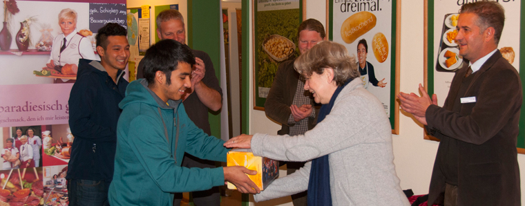 Christof Schneider, Mitarbeiter der Caritas und Ranger Arnold Will berichteten der Staatssekretärin vom Ernteeinsatz von minderjährigen unbegleiteten Flüchtlingen vorzustellen. Um etwas Abwechslung in das Leben der Flüchtlinge zu bringen, die momentan auf der Wasserkuppe untergebracht sind, wurden kürzlich gemeinsam mit den Jugendlichen einige Tonnen Rhöner Äpfel geerntet. Sie wurden zu Saft verarbeitet oder als Tafelobst der Fuldaer Tafel zur Verfügung gestellt. Zwei der Jugendlichen überreichten der Staatssekretärin einen Fünfliterbehälter mit frisch gepresstem Apfelsaft.