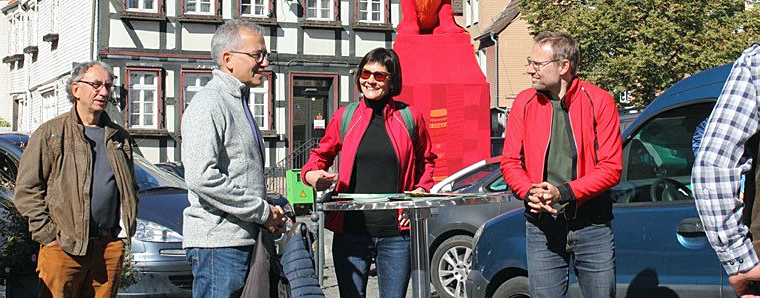 Tarek Al-Wazir und MdL Eva Goldbach mit Ersatzkandidat Daniel Schmidt am Löwendenkmal in Lauterbach.