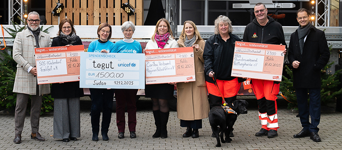 Die Geschäftsführung des Lebensmittelhändlers tegut hat die Erlöse der letztjährigen Weihnachtsverlosung an vier wohltätige Organisationen übergeben. Jeweils 1.500 Euro gingen an UNICEF, das SOS-Kinderdorf, die Rettungshundestaffel Fulda sowie die Caritas Fulda.