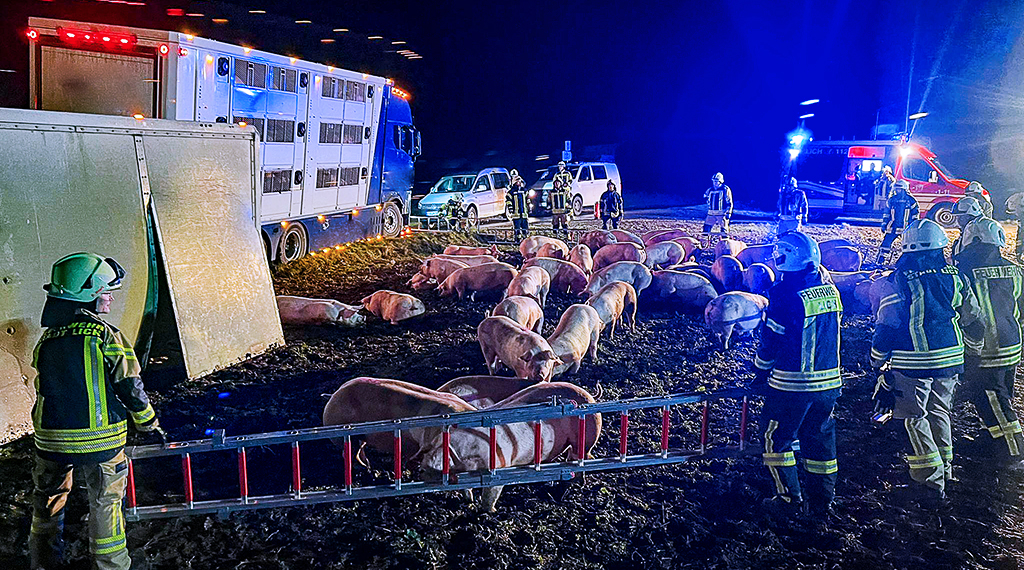 Nach dem Unfall bot sich den Einsatzkräften ein außergewöhnliches Bild: Mehrere Schweine liefen frei umher und mussten zunächst wieder eingefangen werden. Mit viel Improvisationstalent errichtete die Feuerwehr mithilfe von Leitern eine Art provisorischen Pferch. Dort konnten die Tiere zur Ruhe kommen, bevor sie schließlich umgeladen wurden.