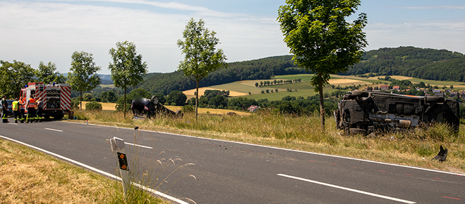 Ein 75-jähriger Fahrzeugführer aus der Gemeinde Hofbieber befuhr mit seinem Dacia einen Wirtschaftsweg und wollte die Landstraße in Richtung Nüsttal-Gotthards überqueren. Nach derzeitigem Sachstand übersah der wartepflichtige Dacia-Fahrer beim Überqueren der Landstraße einen bevorrechtigten 29-jährigen Fahrzeugführer aus Tann, der mit seinem VW Kleinbus in Fahrtrichtung Fulda unterwegs war, und stieß mit diesem zusammen. Durch die Wucht des Anpralls überschlugen sich beide Fahrzeuge. Im weiteren Verlauf kam der Dacia auf dem Dach und der VW Kleinbus auf der Seite auf einem angrenzenden Feldweg zum Liegen. Der Dacia-Fahrer wurde in seinem Fahrzeug eingeklemmt. Mittels einer sogenannten Crash-Rettung wurde der Fahrer von der Feuerwehr Hofbieber aus dem Fahrzeugwrack geholt. Trotz sofortiger ärztlicher Versorgung verstarb der Fahrer noch an der Unfallstelle. Der Fahrer des VW Kleinbusses sowie seine fünf Mitfahrer (zwischen 25 und 47 Jahren aus Tann) wurden durch das Unfallgeschehen leicht verletzt, konnten das verunfallte Fahrzeug selbstständig verlassen und wurden an der Unfallstelle ärztlich versorgt. Der entstandene Sachschaden wird auf etwa 60.000 Euro geschätzt. An der Unfallstelle waren sechs Rettungswagen und drei Notärzte sowie die Feuerwehr Hofbieber mit insgesamt 26 Einsatzkräften eingesetzt. Nach Rücksprache mit der Staatsanwaltschaft Fulda wurde ein Gutachter mit der Unfallrekonstruktion beauftragt. Die Ermittlungen dauern an. +++
