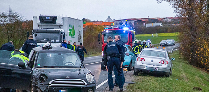 Nach aktuellem Kenntnisstand mussten mehrere Fahrzeugführende auf der Bundesstraße in Richtung Fulda, kurz nach der Auffahrt Böckels, aufgrund eines Rückstaus mitunter bis zum Stillstand abbremsen. Eine Fahrerin eines Renault schaffte es noch, ihren Zoe rechtzeitig abzubremsen. Ein nachfolgender Fahrer eines VW Passat lenkte seinen Pkw rechtsseitig auf einen angrenzenden Grünstreifen, um einen Zusammenstoß zu vermeiden. Ein ihm folgender 37-jähriger BMW Mini-Fahrer aus Poppenhausen erkannte die Situation vermutlich nicht mehr rechtzeitig, touchierte aus noch unklarer Ursache die beiden vorausfahrenden Fahrzeuge, drehte sich und geriet anschließend in den Gegenverkehr. Dort kollidierte er mit seiner Fahrerseite mit einem entgegenkommenden VW Touran.