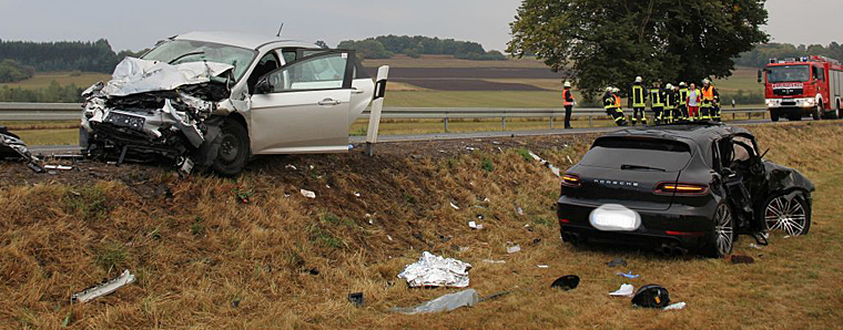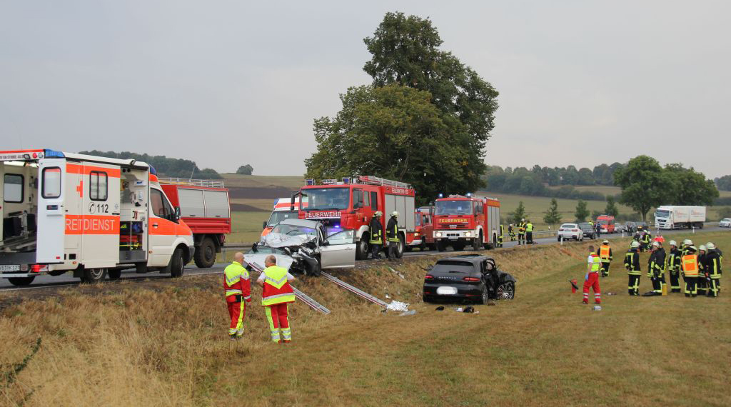 Am Dienstagnachmittag ist es auf der B275, zwischen Ilbeshausen und Herbstein im Landkreis Vogelsbergkreis, ein 28-Jähriger bei einem schweren Verkehrsunfall ums Leben gekommen. Ein 19-Jähriger wurde lebensbedrohlich verletzt. Um kurz nach 16 Uhr setzte der Fahrer eines Porsche Macan trotz des zu dieser Zeit herrschenden Starkregens zu einem Überholvorgang an. Aufgrund von Aqua Planing kam das Fahrzeug ins Schleudern und geriet daraufhin auf die Gegenfahrbahn, hier kollidierte er mit einem entgegenkommenden Ford Focus. Der Porsche prallte mit der Beifahrerseite in den Ford und schleuderte weiter bis auf einen Acker, wo er schwer beschädigt zum Stehen kam. Der 28-jährige Fahrer erlag noch am Unfallort seinen schweren Verletzungen. Der 19-jährige Fahrer des Ford Focus musste von der Feuerwehr mit hydraulischem Rettungsgerät aus seinem Fahrzeug befreit werden. Er wurde mit lebensbedrohlichen Verletzungen mit einem Rettungshubschrauber in die Uniklinik Gießen geflogen. Angehörige mussten an der Unfallstelle von Notfallseelsorgern betreut werden. Etwa 40 Einsatzkräfte der Feuerwehr, Polizei und des Rettungsdienstes waren vor Ort. Ein Gutachter wurde hinzugezogen. +++