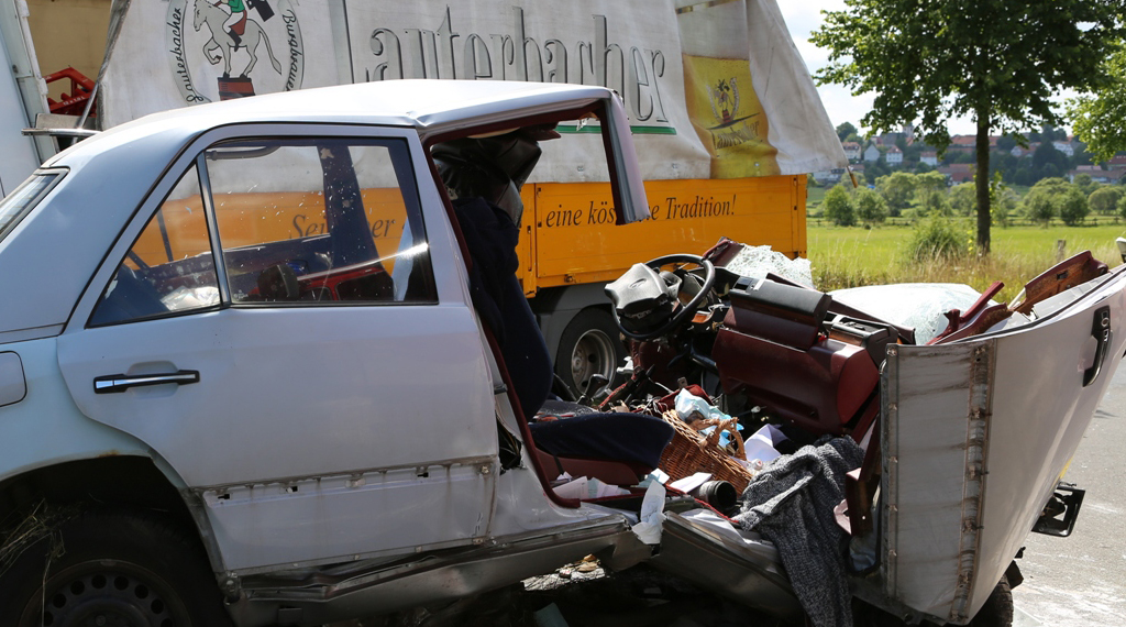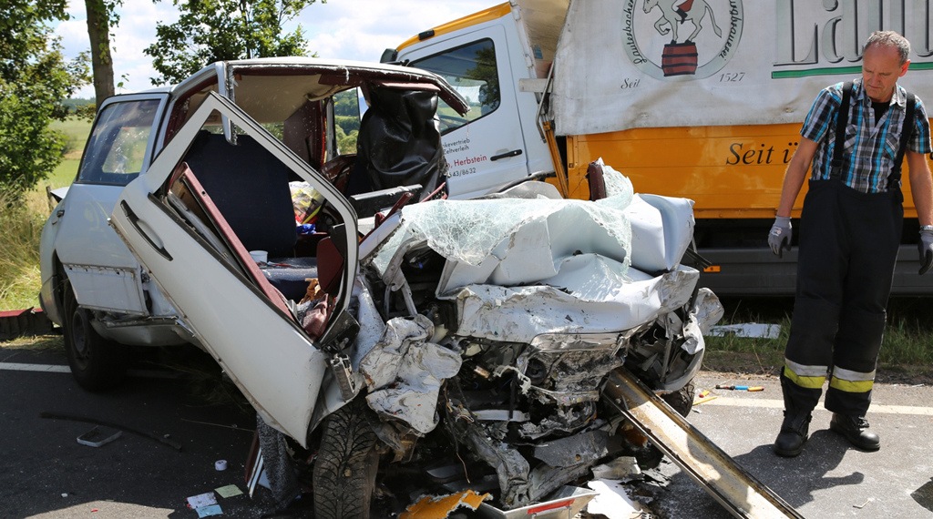 Lauterbach. Für den Insassen eines Mercedes endete am Freitagmittag ein Verkehrsunfall nahe Lauterbach tödlich. Nach bisherigen Ermittlungen am Unfallort kann nicht bestätigt werden, dass der Fahrer des Pkw, der in Richtung Herbstein fuhr, zum Überholen angesetzt hatte. Der Pkw war auf der Bundesstraße 275 zwischen der Kreisstadt Lauterbach und Herbstein in den Gegenverkehr geraten und frontal in einen Getränkelaster geprallt. Durch den Aufprall wurde die einzige Person in dem Mercedes sofort tödlich verletzt, die beiden Insassen des Lastwagens zogen sich leichte Verletzungen zu. Die Feuerwehr der Stadt Lauterbach war zur Bergung des tödlich Verletzten im Einsatz. Mit hydraulischen Rettungsgeräten schnitten Feuerwehrleute das eingeklemmte Unfallopfer aus dem Fahrzeugwrack. Die Bundesstraße war während der Rettungs- und Bergungsarbeiten voll gesperrt. Zur Klärung der Unfallursache ist ein Gutachter eingeschaltet. Der getötete Fahrzeugführer war 55 Jahre alt und aus der Gemeinde Grebenau. Der 63-jährige Lkw-Fahrer und sein 53 Jahre alter Beifahrer sind mit leichten Verletzungen in ein nahegelegenes Krankenhaus eingeliefert worden. Es entstand ein Sachschaden von rund 10000 Euro. +++ fuldainfo | pw