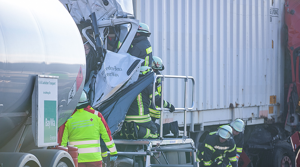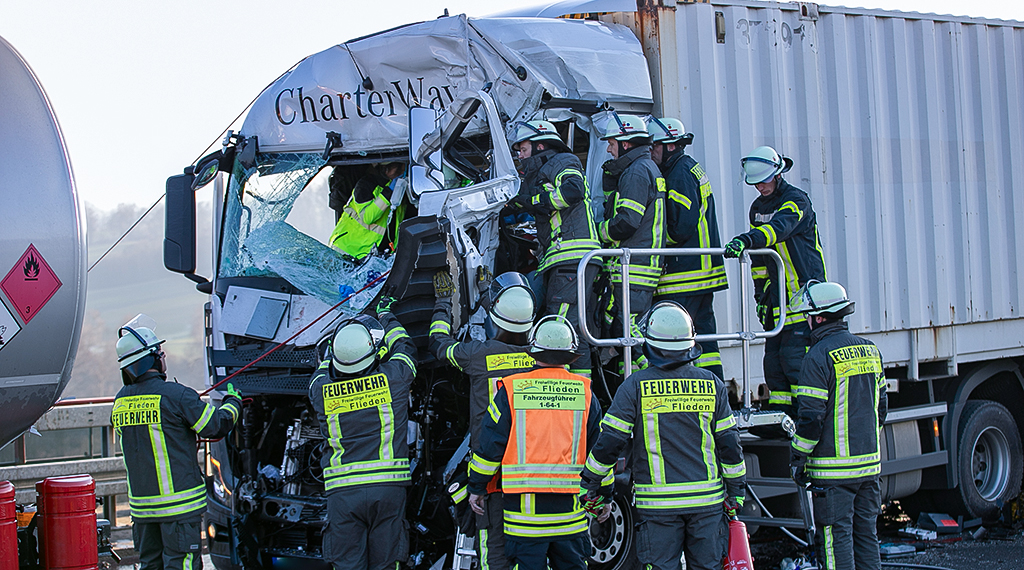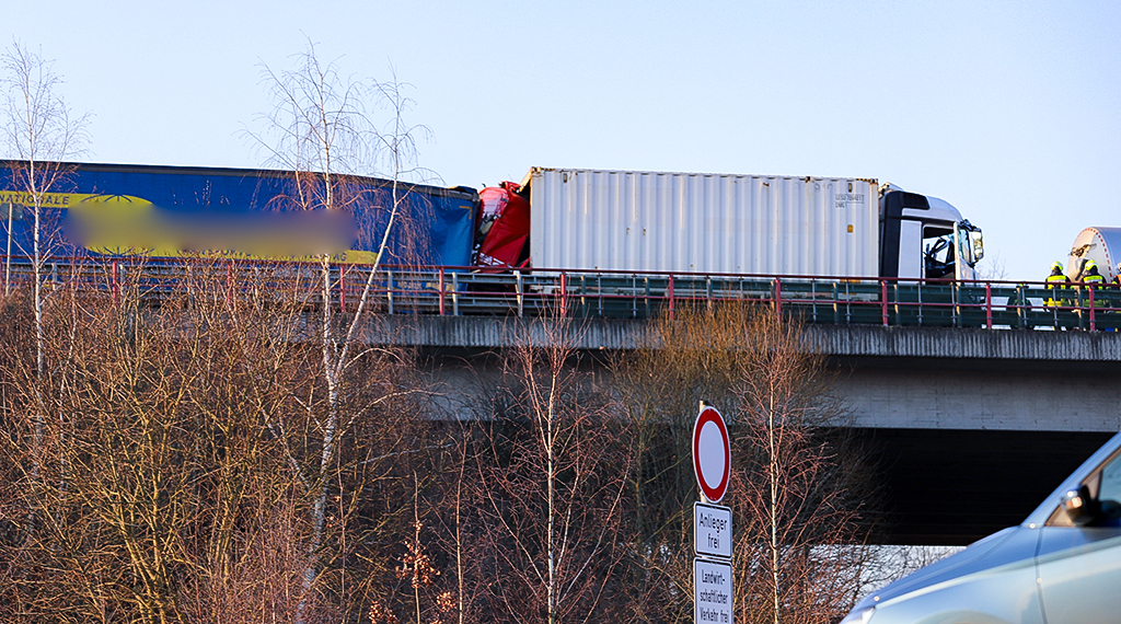 Ein Bauerprotest an der A66 und der daraus resultierende Stau hatte am Nachmittag in Hessen tödliche Folgen: Ein schwerer Lkw-Unfall auf der A66 in Osthessen hat am Mittwochnachmittag ein Todesopfer gefordert. Ersten Angaben zufolge übersah der Fahrer eines Lkw nahe der Anschlussstelle Flieden das Ende eines Staus, der sich aufgrund eines Traktorkonvois im Rahmen der Bauernproteste gebildet hatte, und fuhr auf einen weiteren Lkw auf, der wiederum auf einen mit Heizöl beladenen Tanklastzug geschoben wurde. Die Fahrer der beiden hinteren Fahrzeuge wurden in ihren Fahrerkabinen eingeklemmt. Zahlreiche Rettungskräfte rückten an; Feuerwehrleute befreiten die Eingeklemmten aus den Wracks. Für den Unfallverursacher kam jede Hilfe zu spät; er verstarb noch an der Unfallstelle. Der aus dem mittleren Lkw befreite Fahrer erlitt schwere Verletzungen und wurde in ein Krankenhaus gebracht. Rund 14.500 Liter Heizöl liefen aus dem Tanklastzug auf die Fahrbahn. Aufwändige Bergungs- und Reinigungsmaßnahmen wurden nötig. Die Autobahn musste in Richtung Fulda voll gesperrt werden. Es kam zu erheblichen Verkehrsbehinderungen. +++