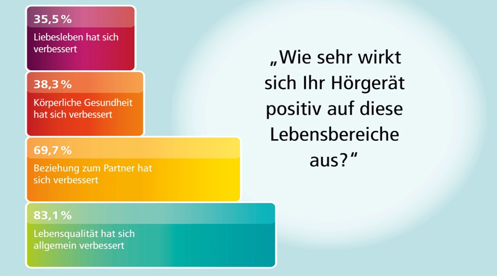 Daneben hat eine internationale Studie der gemeinnützigen Unternehmensstiftung „Hear the World“ ergeben, dass eine effiziente Hörsystem-Versorgung, viele Vorteile mit sich bringt: 83,1 Prozent der befragten Hörsystem-Träger teilten mit, dass sich ihre Lebensqualität allgemein verbessert habe. 67 Prozent sprachen von einer Verbesserung ihrer Beziehung zum Partner, 38,5 Prozent von einer Verbesserung ihres Liebeslebens. Die Nutzung eines Hörsystems, wird für viele Menschen immer selbstverständlicher; Ganz so, wie das Tragen einer Brille. „Mit der heutigen Technologie, die fast unsichtbar – entweder im oder hinter dem Ohr – verschwindet, muss auch niemand mehr sehen, dass man ein Hörsystem trägt“, betont Andreas Trabert. +++
