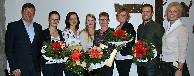Geschäftsführer Andreas Trabert (links im Bild), Ehefrau Annette Trabert (rechts im Bild) und Tochter Valentina (Dritte von links) danken ihren langjährigen Mitarbeitern (v.l.n.r.): Karolina Witzigmann, Elena Treichl, Petra Schweinfest, Hildegard Baier und Sebastian Kraus.