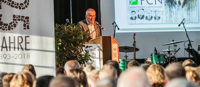 FCN habe alle industriellen Entwicklungsschritte seit Industrie 1.0 mitgemacht, so Nüdling, von der Mechanisierung über Einführung der EDV bis zur aktuellen Digitalisierung in Zeiten von Industrie 4.0. Er ging auf den Unternehmensgründer Franz Carl Nüdling ein, der einst den Bahnbau in der Rhön nutzte, um Baumaterialien für die neue Zugstrecke Fulda – Hilders sowie für den Straßenbau herzustellen, auf den Umzug der Unternehmenszentrale nach Fulda, auf nachfolgende Generationen und viele FCN-Meilensteine – etwa die erste Asphaltmischanlage, die 1932 im Basaltwerk Seiferts errichtet wurde. Gegen Ende des Krieges wurden im Werk Seiferts die ersten Betonsteinprodukte hergestellt, 1947 startete die erste maschinelle Produktion von Betonprodukten im Werk Rupsroth. 1951 dann die Übernahme des Basaltwerks Suhl. Anfang der 1960er Jahre stand FCN bereits auf mehreren Standbeinen: Gesteinskörnungen für den Straßen- und Betonbau sowie die Weiterveredelung des eigenen Materials in Asphaltmischgut und kleinformatige Betonprodukte. Mit der Übernahme des Betonwerks Grünkorn in Fulda ergänzten ab 1964 Betonrohre und Fertigteile das Produktsortiment. Die 1970er und 1980er Jahre waren geprägt von Erweiterungen des Produktsortiments, und die EDV hielt Einzug in Buchhaltung und Produktion.