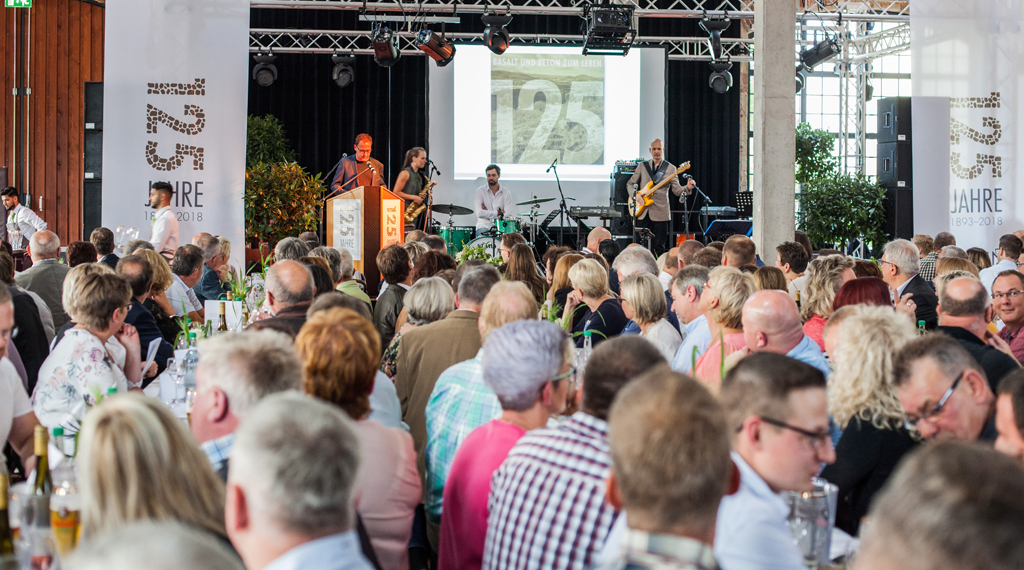 „125 Jahre FCN, 125 Jahre Familienunternehmen, 125 Jahre kontinuierliche Entwicklung. Es muss etwas dran sein, wenn zu unserem Firmenjubiläum ein Artikel in der Fachzeitschrift ,Baustoffmarkt‘ überschrieben wurde mit ,Starke Wurzeln‘“, begann FCN-Geschäftsführer Peter Nüdling seine Ansprache zur Jubiläumsfeier für die FCN-Mitarbeiter und deren Angehörigen. Mehr als 400 Gäste waren der Einladung in den alten Hünfelder Lokschuppen gefolgt und blickten gemeinsam mit der Geschäftsführung auf die erfolgreiche Unternehmensgeschichte zurück.