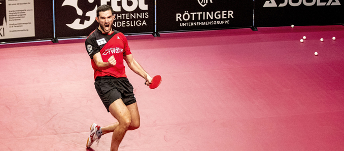 Erstaunlich souverän präsentierte sich der TSV Bad Königshofen, der die Misserfolgsserie von vier Niederlagen in Folge durch ein 3:1 gegen den ASV Grünwettersbach beendete. Dabei trotzten die Unterfranken sogar dem Fehlen von Bastian Steger, der verletzungsbedingt kurzfristig passen musste. Sein Vertreter Abdel-Kader Salifou avancierte zum entscheidenden Mann. Mit einer 0:3-Bilanz in der TTBL in den Spieltag gegangen, tat der Franzose am Sonntag alles, um diese aufzupolieren. Im Auftakteinzel fuhr Salifou ein 3:1 (13:11, 12:10, 4:11, 11:8) gegen Tobias Rasmussen ein; im Spitzeneinzel machte er wenig später alles klar für den TSV durch ein 3:2 (11:8, 6:11, 5:11, 12:10, 11:9) gegen Wang Xi. „Zum ersten Mal habe ich in der TTBL zwei Siege feiern können. Ich werde heute Nacht bestimmt gut schlafen“, sagte der 30-Jährige anschließend.