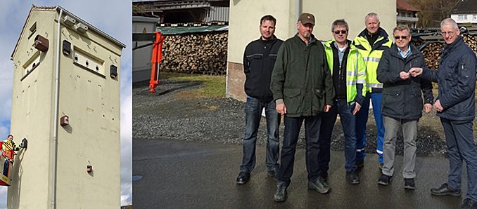 Matthias Hahner (Geschäftsführer der OsthessenNetz GmbH) übergibt Peter Paul (1. Bürgermeister von Mittelsinn) den Schlüssel zur umfunktionierten Turmstation; daneben Bernd Christ (Monteur ServiceCenter Süd der OsthessenNetz GmbH), Hans-Michael Schäfer (Sachgebietsleiter ServiceCenter Süd der OsthessenNetz GmbH), Naturschützer und Ornithologe Armin Welzenbach, und Torsten Weigand (Baukoordinator ServiceCenter Süd der OsthessenNetz GmbH). Im Hintergrund bringt Heribert Reißer (Monteur ServiceCenter Süd der OsthessenNetz GmbH) einen Vogelkasten an. (v.r.n.l.)