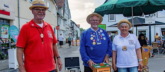 Walter Günther ist 87 Jahre alt und spielt immer noch auf verschiedenen Veranstaltungen. „Also wenn Drehorgelspieler lange spielen, wären sie über 100“, fügt Helmut Hofmann hinzu, der zusammen mit seiner Frau Ulla mit von der Partie ist. „Wir kennen uns schon lange. Ich habe auch die Ulla zum Orgelspielen gebracht, sie wollte erst nicht, aber jetzt macht sie es mit Bravour“, betont Walter Günther. Ulla und Helmut Hofmann nennen sich mit dem Künstlernamen „Hessen Helmut und Ulla“, die als „Niestetaler Pfeifen“ mit zwei alten Drehorgeln für besondere Klänge sorgen.