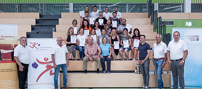 Die erste C-Lizenz-Übungsleiterausbildung für den Breitensport im Landkreis Fulda fand nun ihren Abschluss. Den 20 Teilnehmenden blieben durch die Kurse in der Kreissporthalle Hofbieber an insgesamt acht Wochenenden die Fahrten in die Bildungsstätten des Landesportbundes in Frankfurt, Kassel oder Wetzlar erspart. Möglich war das durch die Unterstützung des Landkreises Fulda und des Sportkreises Fulda-Hünfeld. „Das war eine super Kooperation, und ich hoffe, dass wir da weiter machen“, sagte Dr. Frank Obst, Ausbildungsleiter des Landessportbundes Hessen (lsb h) bei der Überreichung der Lizenzen.