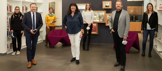 Carolin Stock (Hochschule Fulda), Hochschulpräsident Professor Dr. Karim Khakzar, Edith Wiegand (Hochschule Fulda), Bibliotheksdirektorin Dr. Marianne Riethmüller, (...) Fred Vey und Franziska Röder (beide Möller Vey + Partner) (v.l). Foto: Nicole Dietzel