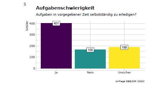 Als kleinen Vergleich: Es waren 1872 Eltern mit Kindern in den Jahrgangsstufen 1 bis 6, von denen hatten 515 Eltern Anspruch auf einen Notbetreuungsplatz. Setzt man dies in Relation, so erkennt man eine eindeutige Doppelbelastung der Eltern durch das Homeschooling. So hatten von den 2119 Eltern mit Kindern in den Jahrgangsstufen 1 bis 9 1709 Eltern die Doppelbelastung der Arbeit und des Homeschoolings. Die Freitexteingaben der Eltern unterstreichen diesen Eindruck deutlich. Positiv wurde seitens der Eltern hervorgehoben, dass manche Lehrer anriefen, um sich nach den Kindern zu erkundigen und wie diese mit den Aufgaben zurecht kämen. Auch das Feedback einzelner Lehrer nahmen die Eltern positiv wahr. Vereinzelt brachten z.B. Grundschullehrer Aufgaben zu den Kindern und holten die bereits erledigten zur Durchsicht ab. Struktur der Aufgaben in Wochenplänen als auch die gestiegene Selbstständigkeit der Kinder wurden hier erwähnt. Besonders häufig berichteten die Eltern von der sehr guten Kooperation mit den Elternbeiräten. Negativ wurde genannt, dass es oft zuviele Aufgaben gab und häufig keine Struktur erkennbar war sowie Zeitvorgaben zur Erledigung der Aufgaben fehlten.