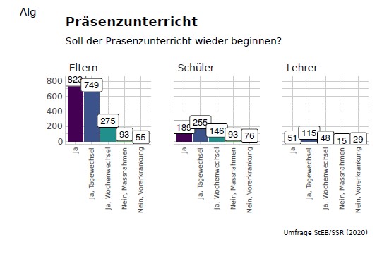 Von der Gruppe der Schüler nahmen 809 Schüler/-innen aller Schulformen an der Umfrage teil. Während der Zeit des Homeschoolings haben die Schüler den Kontakt zu den Lehrkräften als regelmäßig empfunden. Für den Großteil bestand die Möglichkeit, sich zu jeder Zeit an ihren Lehrer zu wenden. Die Aufgaben, die ihnen in den Hauptfächern gestellt wurden, waren im Gegensatz zum Präsenzunterricht mit Mehraufwand verbunden, wohingegen es sich in den Nebenfächern etwa die Waage hielt. Das häusliche Lernumfeld wurde von den Schülern von mittelmäßig bis sehr gut bewertet. Hier kommt es auch stark darauf an, in wie weit die Schüler Unterstützung im Elternhaus erfahren. Einsendungen von Arbeitsaufträgen wurden von Schulen und Lehrern unterschiedlich gehandhabt, es zeigte sich ein breites Spektrum von nicht möglich über freiwillig bis zu verpflichtend notwendig. Eine Rückmeldung der Lehrer war für die Schüler immens wichtig, überwiegend erhielten sie diese auch. Die Schüler sind im Hinblick auf die Rückkehr zum Präsenzunterricht eher unentschlossen, was sicherlich auch mit dem Informationsfluss zusammenhängt. Seitens der Schule und Schulhomepage fühlen sich Schüler schlecht bis gut informiert, seitens der Eltern, Medien und sonstiges ist es gut bis sehr gut.