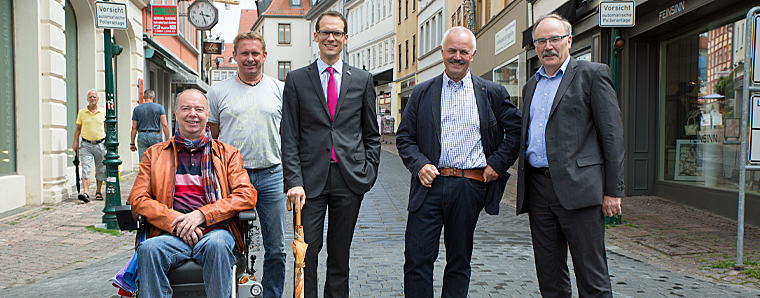 Hanns-Uwe Theele (Vorsitzender des Behindertenbeirates), Roger Möller (Projektleiter), Stadtbaurat Daniel Schreiner, Walter Krah (Vorsitzender des Bauausschusses) und Werner Schäfer (Leiter Tiefbauamt). (v.l.)
