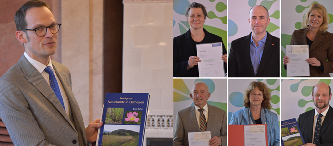 Stellvertretend für den Verein für Naturkunde in Osthessen (VNO) und dessen Publikationsreihe „Beiträge zur Naturkunde in Osthessen“ wurde der Preis in der Kategorie „Würdigung besonderer Umweltaktivitäten/Initiativen/Vereine“ an Dr. Ute Lange und Elmar Kramm verliehen. Anlass für die Nominierung durch das Regierungspräsidium Kassel war die VNO-Veröffentlichung „Der Haimberg, bedrohtes Kleinod zwischen Rhön und Vogelsberg“. Ein insgesamt 17-köpfiges Team an Autorinnen und Autoren des VNO hatte in mehr als dreijähriger Arbeit wissenschaftliche Aufsätze zu den Themenbereichen Vegetation/Botanik und Geologie sowie zu verschiedenen Tiergruppen wie Heuschrecken, Zweiflügler, Wespen, Wildbienen, Tag- und Nachtfalter, Käfer, Wanzen, Mollusken und Vögel erarbeitet. Stadtbaurat Schreiner betonte die „bemerkenswerte Tatsache“, dass der Band bereits weitgehend vergriffen sei: „Das zeigt doch, dass Sie hier komplexe Umweltthemen für ein breites Publikum verständlich und interessant aufgearbeitet – und dafür eine enorme Menge an Zeit, Leidenschaft und Akribie investiert haben.“ Einzelne Exemplare des Buches sind übrigens noch an der Kasse des Vonderau-Museums erhältlich.