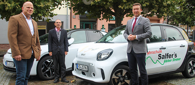 Es ist fast mucksmäuschenstill als Joachim Salfer, Inhaber der gleichnamigen Fahrschule in Schlüchtern (Main-Kinzig-Kreis) und Flieden (Landkreis Fulda) seine neuen Errungenschaften auf dem Stadtplatz in Schlüchtern präsentiert. Denn die Motoren der Stromflitzer hört man kaum. Zwei moderne Elektroautos vergrößern die Flotte von Salfers Fahrschule. Damit ist sie der Vorreiter in Schlüchtern und Flieden. Schlüchterns Bürgermeister Matthias Möller (parteiunabhängig) ist mächtig stolz auf das Projekt. Auch Christian Ackermann aus dem Fliedener Gemeindevorstand beglückwünscht Salfer.