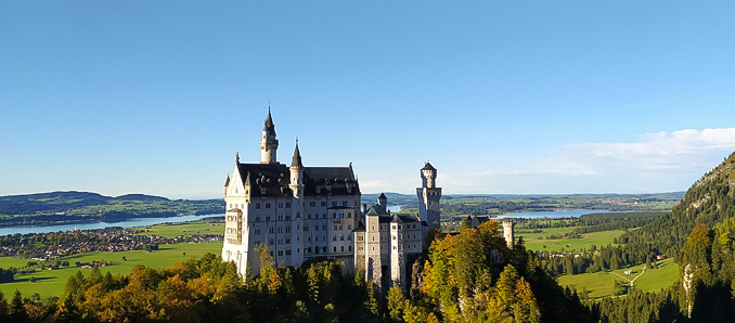 Neuschwanstein wurde als erstes der vier Schlösser erbaut und gilt mit seinen romantischen Türmen und seiner exponierten Lage vor Bergkulisse als Inbegriff des Märchenschlosses. Innen dominieren Motive aus Wagner-Opern: Tannhäuser, Lohengrin, Tristan und Isolde, Parsifal – der Opernstoff findet sich in Wandmalereien und Holzarbeiten wieder, in Porzellanfiguren und Stickereien. Wohn- und Arbeitszimmer ließ der König durch eine künstliche Grotte verbinden.