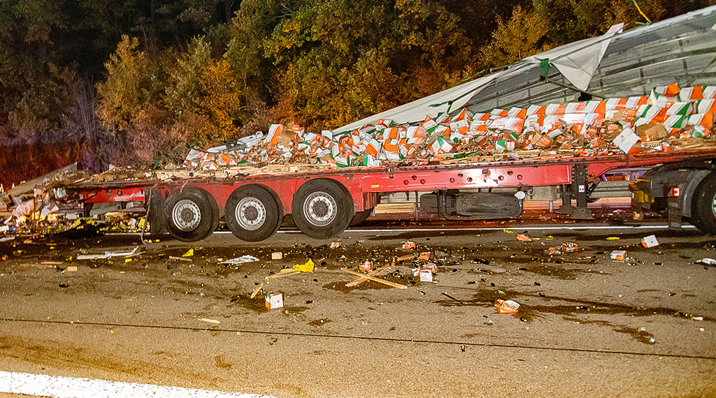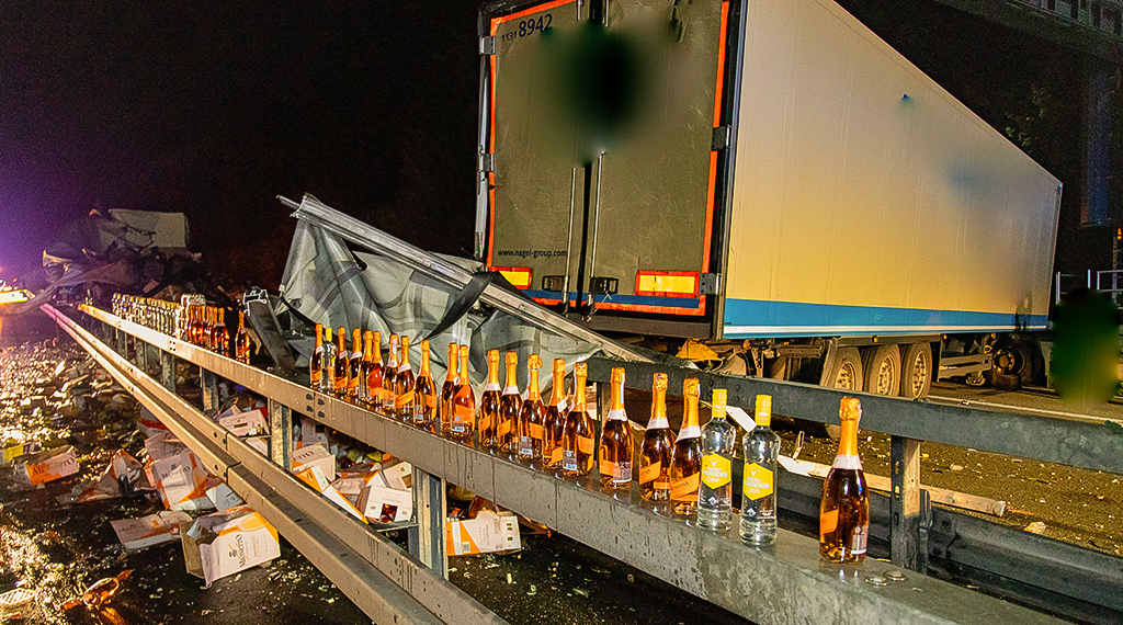 Bei dem Zusammenstoß riss die Plane des auffahrenden Sattelzugs auf, wodurch das transportierte Ladegut – Lebensmittel, Sekt und Spirituosen – über beide Fahrbahnen verstreut wurde. In der Folge musste auch die Richtungsfahrbahn Süden vorübergehend gesperrt werden. Gegen 2.50 Uhr konnte der Verkehr dort über den Standstreifen wieder freigegeben werden, der Rückstau löste sich innerhalb von etwa 50 Minuten auf.