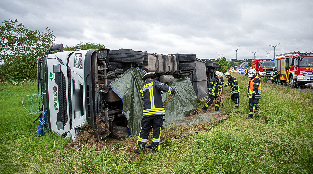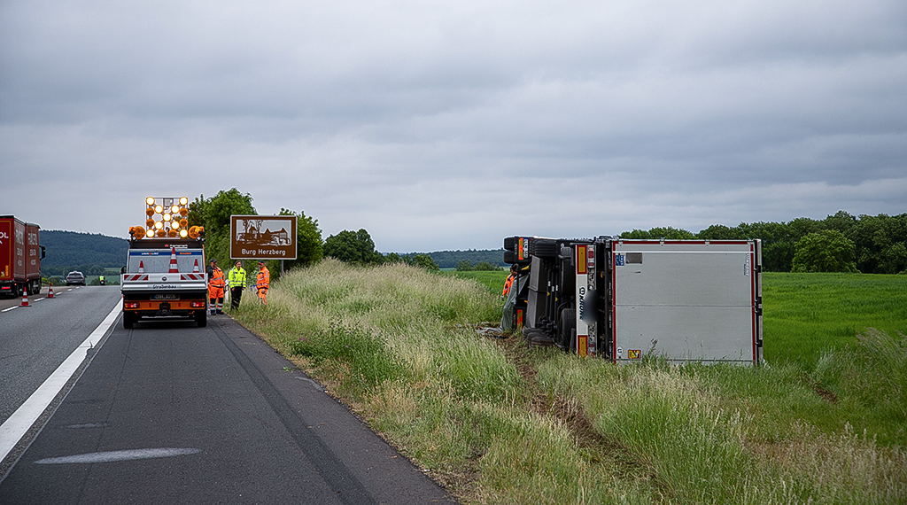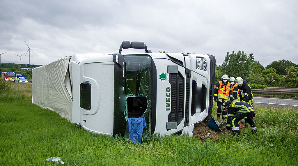 Schwerer Unfall am Freitagmorgen auf der A5 bei Alsfeld: Ein Lkw kam von der Autobahn ab, geriet auf eine Wiese und stürzt auf die Seite. Der 56 Jahre alte Fahrer wurde dabei leicht verletzt und musste vom Rettungsdienst behandelt werden. Die Unfallursache ist noch unklar. Die Polizei ermittelt, beim Fahrer wurde eine Blutprobe angeordnet. Der Verkehr konnte an der Unfallstelle vorbeifließen; es gab keine Behinderungen. Mehr Blaulichtberichte auf unserer Blaulichtseite - osthessen112.