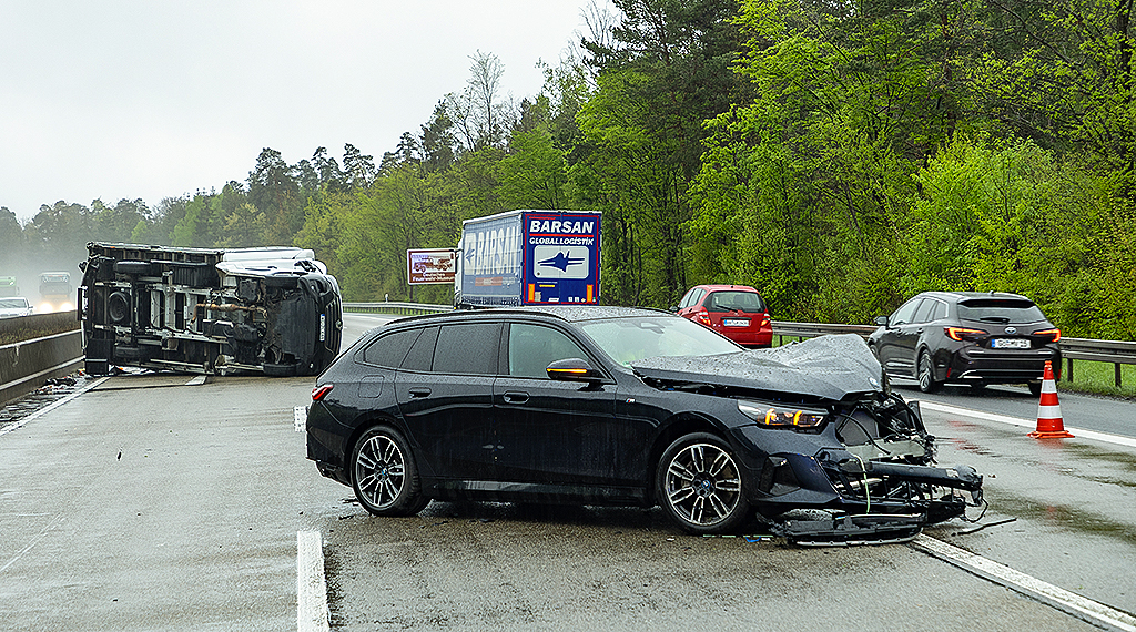 Nach ersten Informationen kam ein BMW mit Hamburger Kennzeichen ins Schlingern. Ein 44-jähriger Fahrer aus Ulm steuerte den Wagen; die Nässe auf der Fahrbahn brachte ihn nach rechts in die Leitplanke. Er berührte einen kleinen Lkw aus Polen, in dem ein 31-jähriger ukrainischer Fahrer saß. Infolgedessen kippte dieser Lkw auf die Seite und blieb quer auf der linken und mittleren Spur liegen. Laut Polizei blieben beide Fahrer unverletzt, obwohl der Sachschaden auf 70.000 bis 90.000 Euro geschätzt wird.