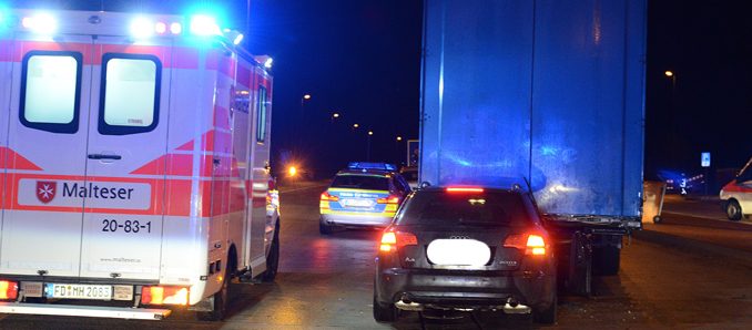 Fulda. Am Donnerstag ereignete sich gegen 20.44 Uhr auf der A7 zwischen den Anschlussstellen Fulda-Mitte und dem Dreieck Fulda ein folgenschwerer Verkehrsunfall. Ein unbekannter männlicher Pkw-Fahrer aus dem Landkreis Fulda, war aus ungeklärter Ursache auf den Sattelzug eines 50-jährigen aus dem Landkreis Güterloh aufgefahren. Hierbei verkeilte sich der Pkw so unter dem Sattelauflieger, das der Pkw noch etwa 400 Meter bis auf einen angrenzenden Parkplatz in Höhe Pilgerzell mitgeschleift wurde. Dort flüchtete der Pkw-Fahrer zu Fuß von der Unfallstelle und ließ seinen schwer verletzten und eingeklemmten 27-jährigen Beifahrer zurück. Dieser musste durch die Feuerwehr aus dem Wagen geborgen werden. Der flüchtige Pkw-Fahrer wurde anschließen durch die Feuerwehr Fulda, den Polizeihubschrauber und mehrere Streifen der Polizei Fulda gesucht. Die Suche verlief jedoch negativ. An den beiden Fahrzeugen entstand ein Sachschaden in Höhe von 25.000 Euro. Die Autobahn war für ca. 35 Minuten voll gesperrt. +++ fuldainfo | bilder: e.freund