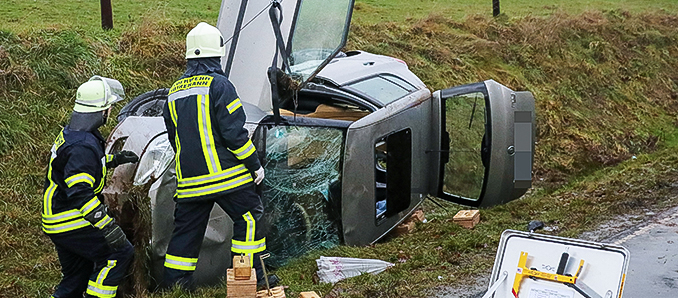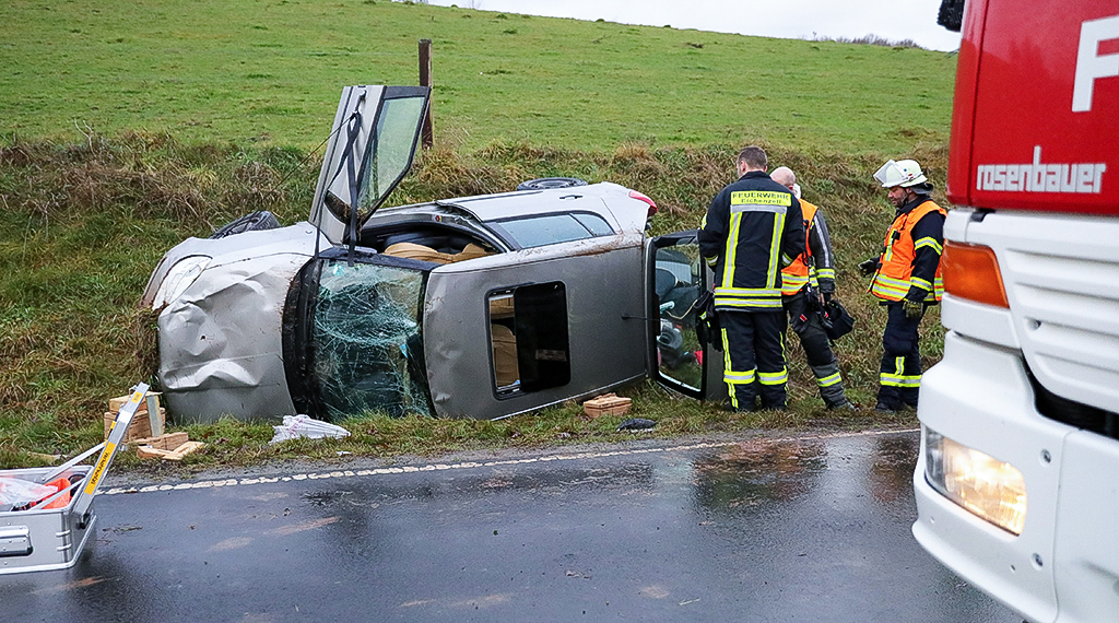 Ein schwerer Unfall hat sich am Montagvormittag bei Döllbach ereignet. Die Fahrerin wurde in ihrem Auto eingeschlossen und musste durch die Feuerwehr und den Rettungsdienst befreit werden. Nach ersten Erkenntnissen fuhr die Frau die Landstraße von Döllbach kommend in Richtung Uttrichshausen, als sie auf regennasser Straße von der Fahrbahn abkam, einen Lkw streifte und dann in den Graben rutschte. Das Auto kam auf der Fahrerseite zum Liegen. Die Feuerwehr sicherte die Unfallstelle und das Fahrzeug ab und befreite die Fahrerin gemeinsam mit dem Rettungsdienst aus dem Auto. Vor Ort waren Rettungsdienst, Notarzt, Polizei sowie die Feuerwehren Eichenzell, Rothemann, Döllbach und Uttrichshausen. +++