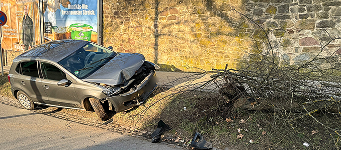 Am Sonntagnachmittag gegen 16 Uhr ereignete sich in der Buseckstraße in Fulda ein Unfall. Ein Auto fuhr dort gegen einen Baum, der an einer kleinen Böschung zwischen Fahrbahn sowie Bürgersteig stand, wobei der Baum entwurzelt wurde. Nach ersten Polizeiangaben fuhr der Wagen vermutlich zu schnell durch die Kurve. Kurz nach der Kreuzung Buseckstraße/Von-Schildeck-Straße/Künzeller Straße traf das Auto den Baum frontal. Der Aufprall war heftig – der Baum wurde aus dem Boden gerissen sowie fiel um. Der Fahrer kam zur Untersuchung in ein Krankenhaus. Die Feuerwehr beseitigte den Baum. Ebenfalls vor Ort waren Polizei sowie Rettungsdienst. +++