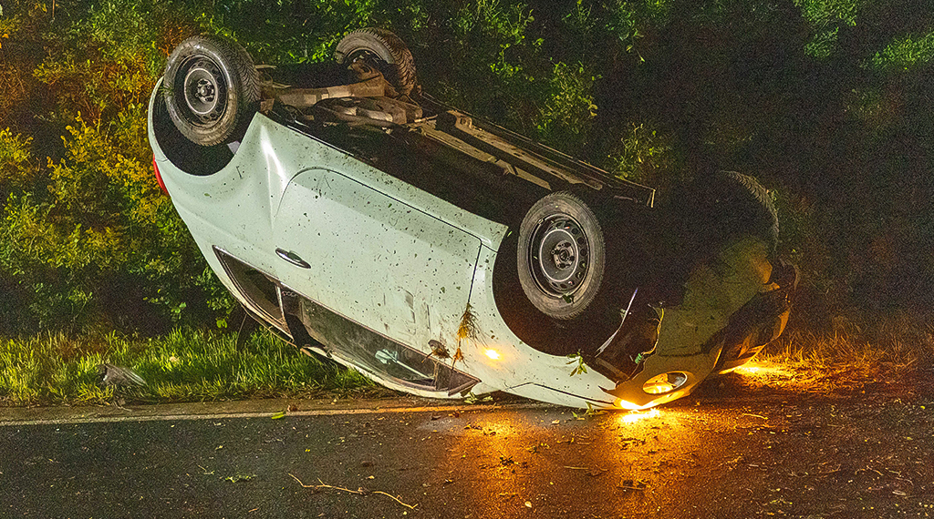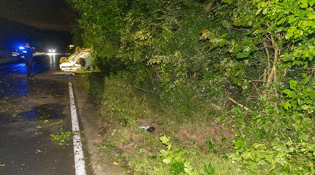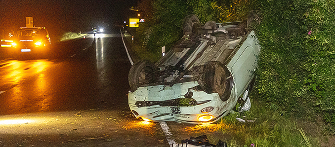 Zu einem schweren Unfall kam es am frühen Sonntagmorgen gegen 2:45 Uhr zwischen Kleinlüder und Oberrode. Eine 23-jährige Frau aus Fulda befuhr mit ihrem Fiat 500 die Landtraße, aus Kleinlüder kommend, in Fahrtrichtung Oberrode. Etwa 100 Meter nach Passieren des Abzweigs „Vemelsruh“ kam die Frau mit ihrem Fahrzeug nach rechts von der Fahrbahn ab und überfuhr die dortige Bankette. In der Folge geriet der Pkw ins Schleudern, überschlug sich mindestens zweimal und kam schließlich auf dem Dach liegend, nach etwa 100 Metern am rechten Fahrbahnrand zum Stillstand. Die Fahrzeugführerin wurde leicht verletzt und konnte sich selbstständig aus dem Fahrzeugwrack befreien. Da der Verdacht auf Alkoholkonsum bei der Fahrerin bestand, wurde eine Blutentnahme angeordnet. Am Pkw entstand Totalschaden in Höhe von ca. 15.000 Euro. Zudem wurden Sträucher am Straßenrand zerstört. Hierbei beläuft sich der entstandene Schaden auf mindestens 500 Euro. Die Strecke war für rund 90 Minuten voll gesperrt. Vor Ort waren die Feuerwehr Fulda, die Feuerwehr Oberrode, der Rettungsdienst und die Polizei. +++