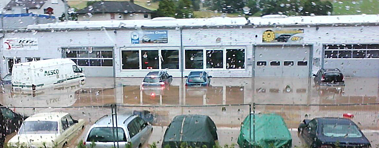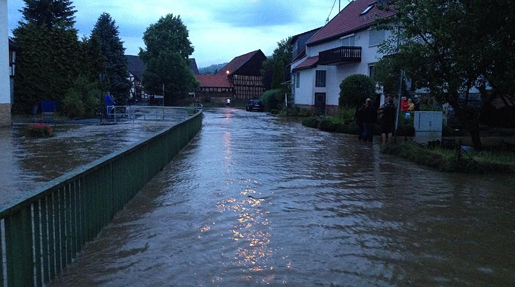 Fulda. Am Donnerstagabend ist über Hessen eine heftige Gewitterfront gezogen. Gegen 17.00 Uhr erreichte die von Osten heranziehende Unwetterfront auch Osthessen und überzog bis 21.00 Uhr den Landkreis Hersfeld- Rotenburg sowie den Vogelsbergkreis mit Starkregen. In den beiden Kreisgebieten kam es zu Überflutungen in verschiedenen Ortslagen. Nach ersten Meldungen sind mindestens 300 Keller vollgelaufen. Einige Haushalte mussten durch die Versorgungsbetriebe vom Stromnetz getrennt werden. In Sorga stand eine Autowerkstatt samt ihrem Fahrzeugabstellplatz unter Wasser. Zahlreiche Straßen waren aufgrund Überflutungen und Erdrutsche gesperrt. Betroffen war auch die Autobahn A4 in Höhe Friedewald in Fahrtrichtung Osten, die mehrfach wegen Überflutung gesperrt und gesäubert werden musste.