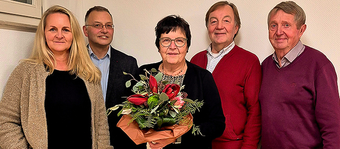 Ursula Veltum (Mitte) wurde für 20 Jahre ehrenamtliche Vorstandstätigkeit von Caritasverband durch (v.l.n.r.) Geschäftsführerin Susanne Saradj, Vorsitzender Raimund Kind, Thomas Engel und Stephan Büttner geehrt. Foto: wim