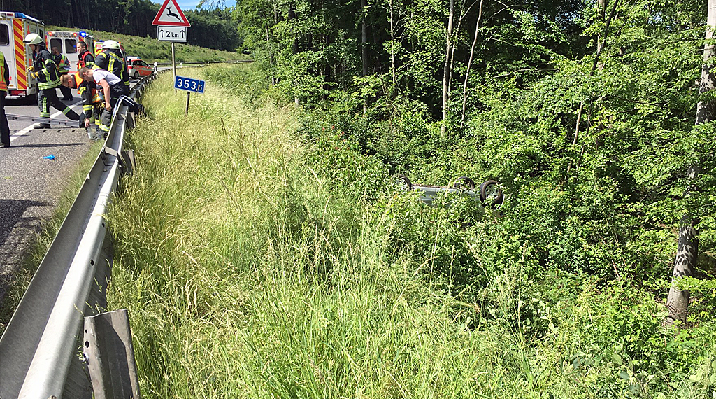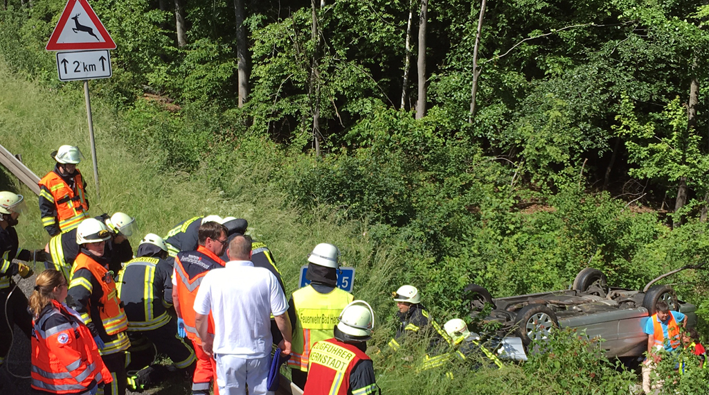 Bad-Hersfeld. Am Sonntag ereignete sich ein gegen 11 Uhr ein Verkehrsunfall auf der A4 Richtung Kirchheim zwischen der Ausfahrt Friedewald und der Ausfahrt Bad Hersfeld verlor ein 84-jähriger Fahrer aus dem Rhein-Neckar-Kreis aus unbekannter Ursache die Kontrolle über seinen Opel. Dieser brach plötzlich nach rechts aus, überschlug sich mehrmals und kam in einem Dornengestrüpp zum Liegen. Anfangs waren beide Insassen eingeklemmt, konnte sich dann später aber aus dem Fahrzeug befreien. Beide Insassen, Fahrer und dessen Ehefrau, wurden zum Glück nur leicht verletzt. Sie wurden beide mit dem Rettungswagen in das Krankenhaus nach Rotenburg verbracht. Aufgrund von Rettungsarbeiten musste die Autobahn ca. 45 Minuten voll gesperrt werden. Anschließend wurde die linke Fahrspur für den Verkehr freigegeben. Die rechte Spur blieb wegen Bergungsarbeiten noch 1 Stunde gesperrt. Der Sachschaden wird auf 5.000 Euro geschätzt. Der angeforderte Rettungshubschrauber Christoph 28 aus Fulda, konnte den Anflug auf die Einsatzstelle abbrechen. Im Einsatz war 1 Notarzteinsatzfahrzeug, 2 Rettungswagen und die Freiwillige Feuerwehr Bad Hersfeld mit 25 Einsatzkräften. +++
