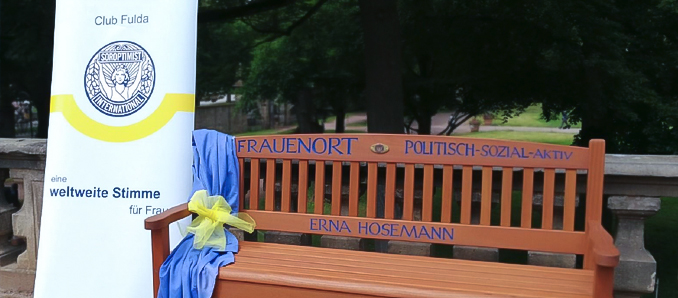 Darauf gingen die Rednerinnen und Redner der feierlichen Einweihungsveranstaltung der neunten „Blauen Bank“ am 10. Juli dieses Jahres ausführlich ein. So würdigte Silvia Hillenbrand, ehemalige Bürgermeisterin von Großenlüder und Mitglied des Hessischen Landtags, unter anderem die frauenpolitische Arbeit Erna Hosemanns, indem sie auf deren Zusammenarbeit mit Elisabeth Selbert und Marie Juchacz verwies. Auch die Tatsache, dass sie über Jahre die einzige Frau der Fuldaer SPD-Fraktion war und später als Stadtälteste wirkte, wurde in den Kontext der damaligen Zeit gestellt. Frau Hillenbrand stellte zudem den Bezug zu den Aktivitäten von Soroptimist International (SI) Club Fulda und dessen Anliegen her: Mit dem Projekt „Blaue Bänke“ das Vermächtnis engagierter Frauen, die in Fulda maßgeblichen Einfluss auf die Stadt und die Gesellschaft nahmen, wachzuhalten. Denn Erna Hosemann war durch ihre Arbeit über Partei- und Regionalgrenzen hinweg sehr geschätzt. So wurde sie mit dem Bundesverdienstkreuz 1. Klasse (1965) und dem Ehrenbrief des Landes Hessen (1973) geehrt.