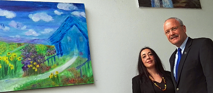 Die Künsterin Antonia Cantalejo u. Bürgermeister Manfred Helfrich vor Bildern im Rathaus-Foyer.